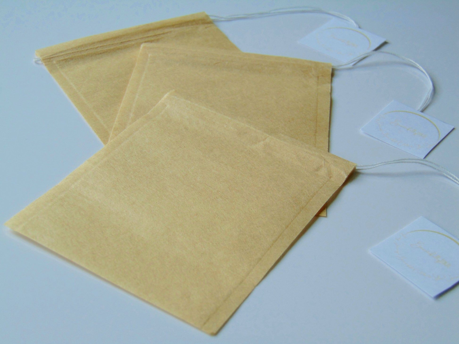 Empty paper tea bags with drawstring design for loose leaf tea.