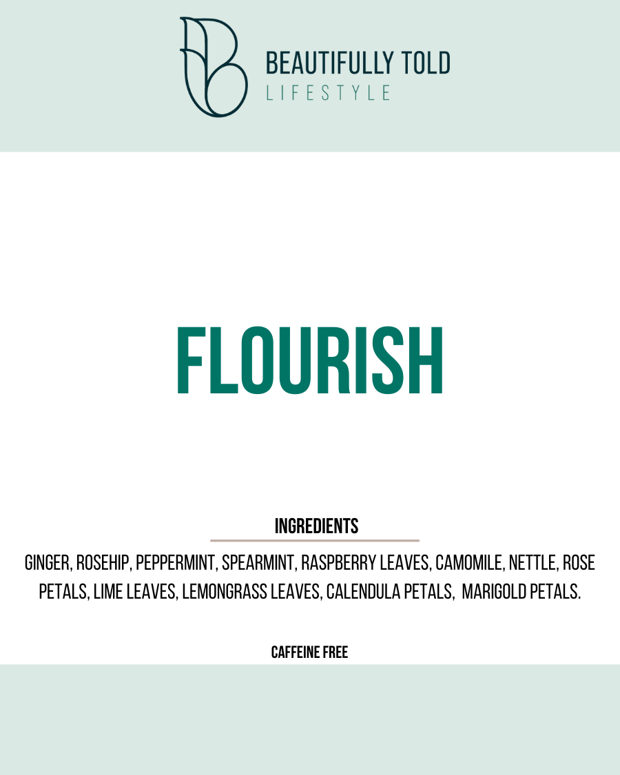 Introducing "Flourish," a premium loose leaf tea blend specifically crafted for women's Womb health. This delightful blend features a refreshing peppermint base infused with a harmonious mix of soothing herbs and flowers to address the pressures, pains, and cramps associated with women's health. With a carefully curated selection "Flourish" offers a natural and effective solution for period woes and overall well-being.