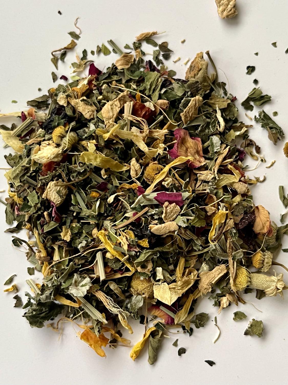 Ingredients: Ginger, Rosehip, Peppermint, Spearmint, Raspberry leaves, Camomile, Nettle, Rose petals, Lime leaves, Lemongrass leaves, Calendula petals, Marigold petals.