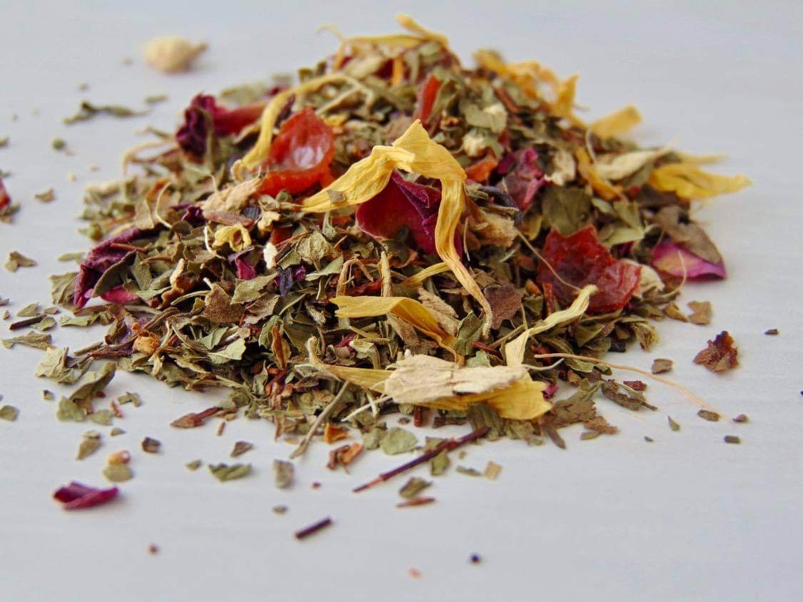 Ingredients: Peppermint, Rosehips pieces, Spearmint leaves, Ginger, Rooibos, Hibiscus petals, Rose petals, Calendula petals, Osmanthus petals