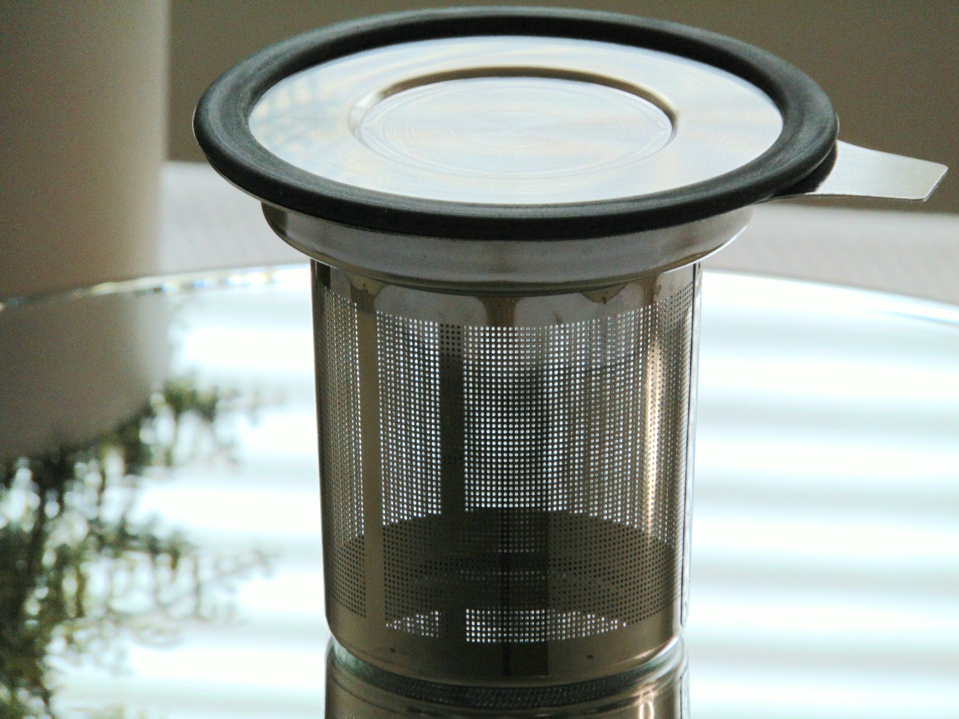 Silver Stainless Steel loose leaf tea infuser with black lid. Made with food grade Stainless steel designed with extra fine holes to keep whole leaf and small fine leaf tea confined.